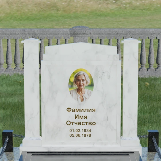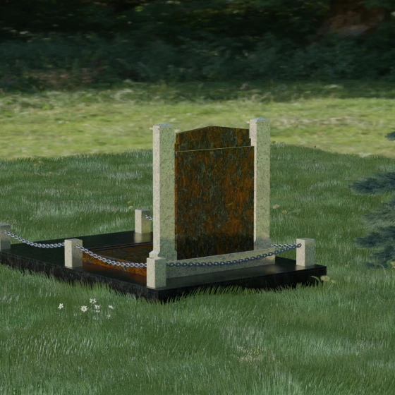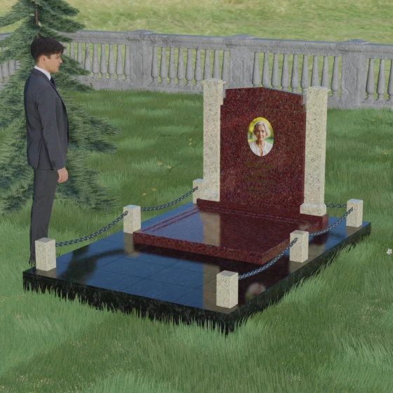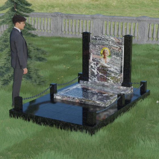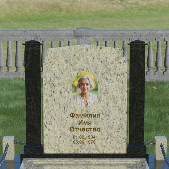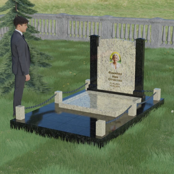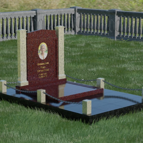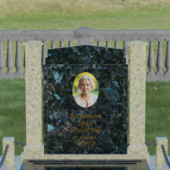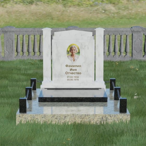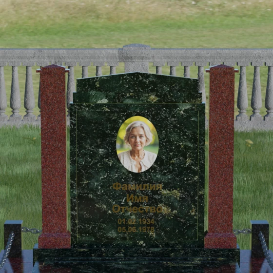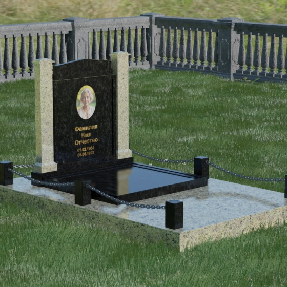 Главной особенностью данного комплекса являются две декоративные колонны, обрамляющие центральную стелу. Эти стройные вертикальные столбы не просто дополняют дизайн, но и служат символом опоры, духовной стойкости и незыблемости памяти. Контрастное сочетание фактур и цветов, представленное в разных вариациях модели, позволяет расставить акценты: выделить центральную часть для портрета или, наоборот, подчеркнуть строгость боковых пилонов. Зеркальная полировка каждой грани создает удивительную игру света — поверхность камня отражает мир вокруг, словно запечатлевая в себе само течение времени, при этом сохраняя безупречный блеск на многие десятилетия.