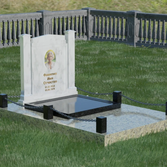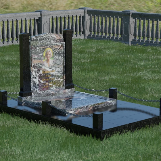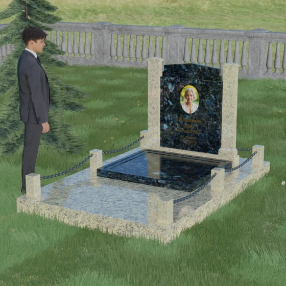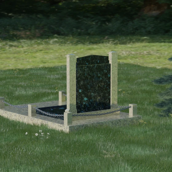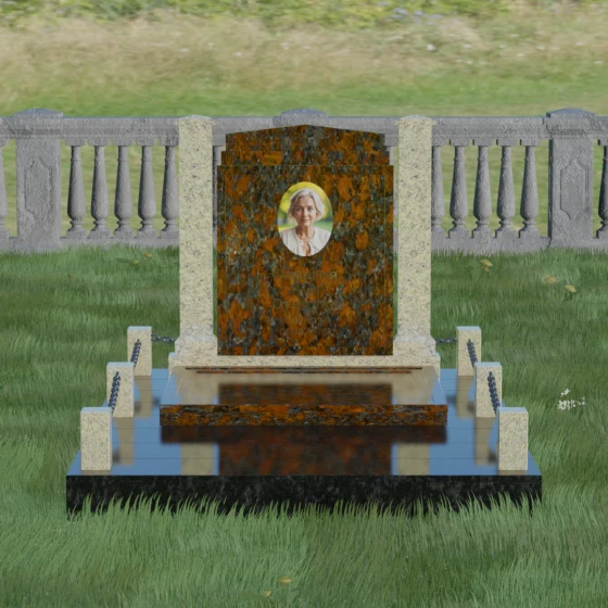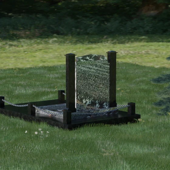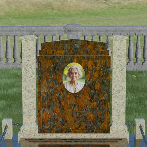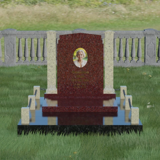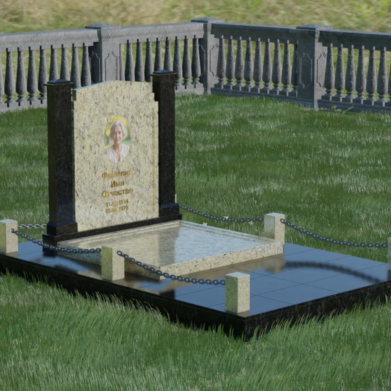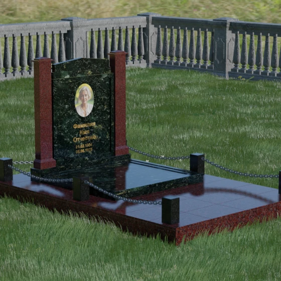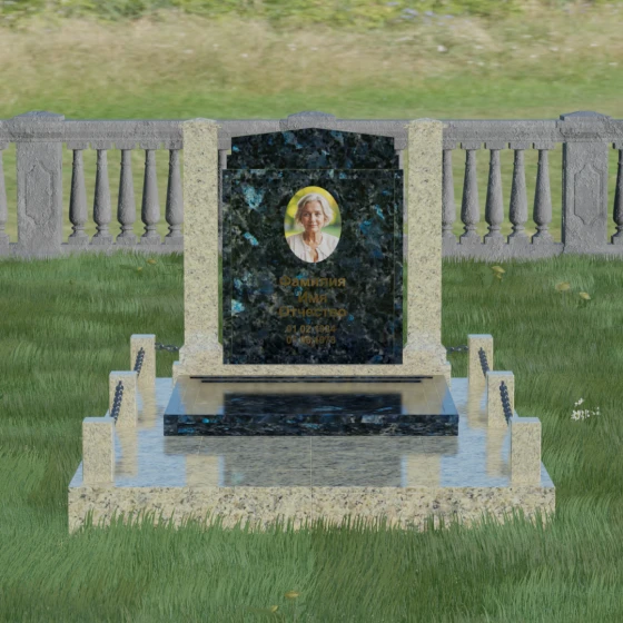 Главной особенностью данного комплекса являются две декоративные колонны, обрамляющие центральную стелу. Эти стройные вертикальные столбы не просто дополняют дизайн, но и служат символом опоры, духовной стойкости и незыблемости памяти. Контрастное сочетание фактур и цветов, представленное в разных вариациях модели, позволяет расставить акценты: выделить центральную часть для портрета или, наоборот, подчеркнуть строгость боковых пилонов. Зеркальная полировка каждой грани создает удивительную игру света — поверхность камня отражает мир вокруг, словно запечатлевая в себе само течение времени, при этом сохраняя безупречный блеск на многие десятилетия.