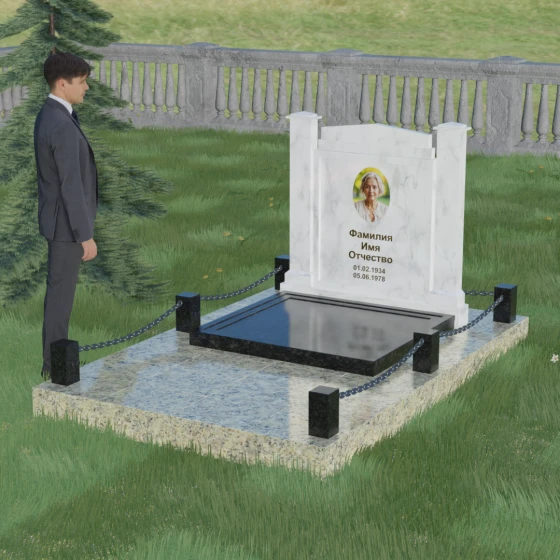 Особого внимания заслуживает полное благоустройство участка, входящее в концепцию модели 011. Памятник устанавливается на массивный гранитный цоколь, который придает всей конструкции устойчивость и защищает её от сезонных подвижек грунта. Вместо открытого цветника здесь используется сплошная надгробная плита, закрывающая всю площадь захоронения. Это создает эстетически законченный, строгий вид и значительно упрощает уход за могилой — вам не придется бороться с сорняками или обновлять засыпку. Завершают композицию аккуратные каменные столбики с декоративными цепями, которые обозначают границы частного пространства, создавая атмосферу уединения и покоя.