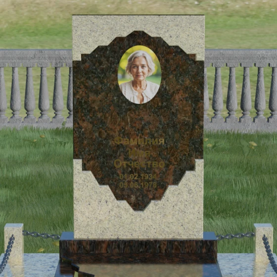 Данное ритуальное изделие представляет собой подлинный триумф художественного минимализма и гармонии контрастов. Центральным элементом композиции является вертикальная стела, выполненная в уникальной технике сочетания двух видов природного камня. Геометрия изделия строится на строгих, безупречно выверенных линиях внешнего контура и изысканной, фигурной резьбе внутреннего сегмента. Светлая вставка из мелкозернистого гранита, обрамленная темным камнем, напоминает античный портал или драгоценную раму, выполненную в стиле барокко. Фигурные фаски по краям светлого элемента создают ритмичный узор, который смягчает строгость прямоугольной формы, придавая мемориалу индивидуальность и торжественность.