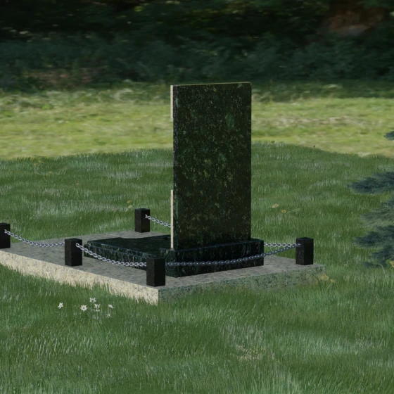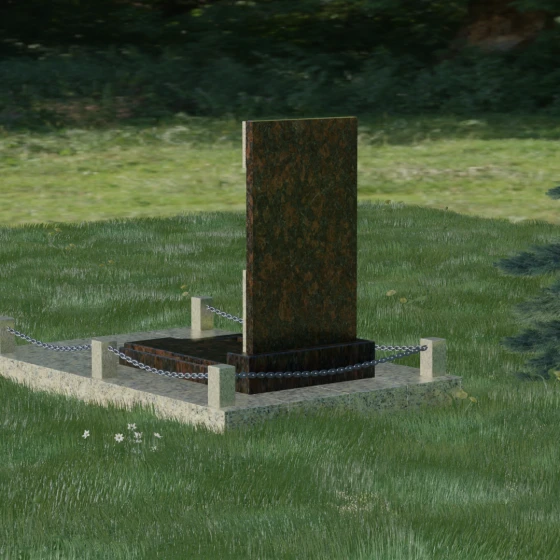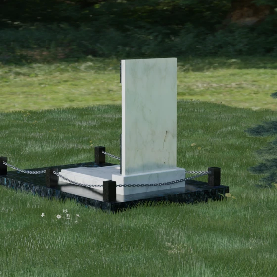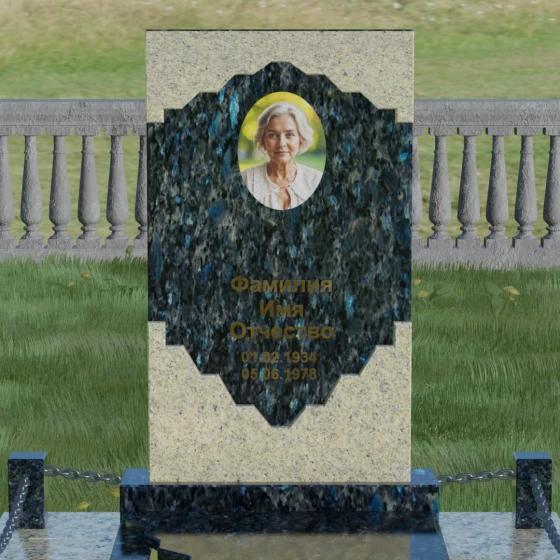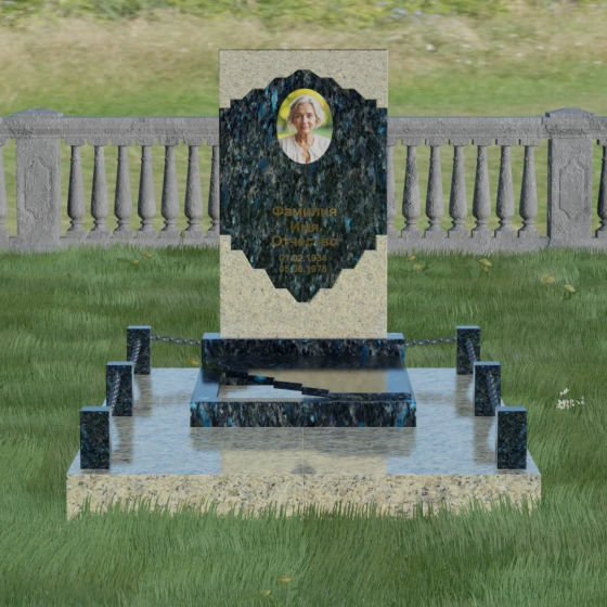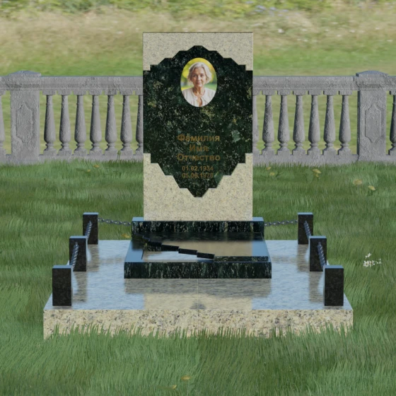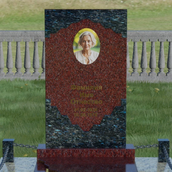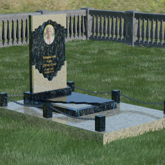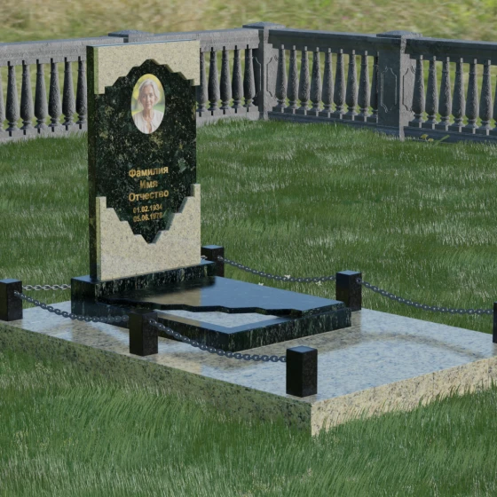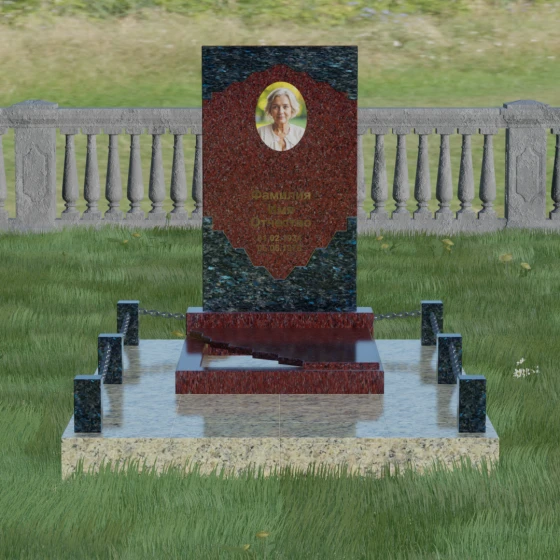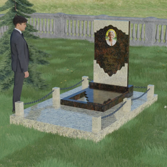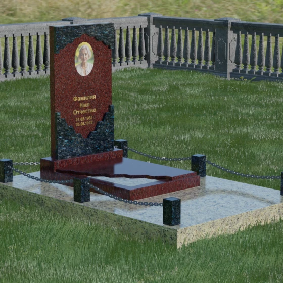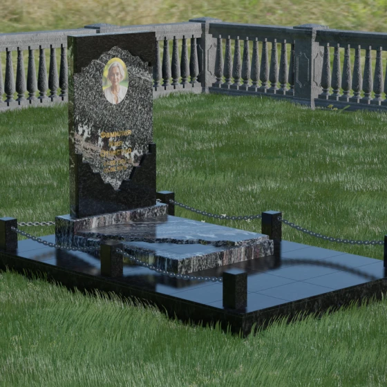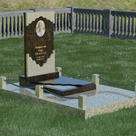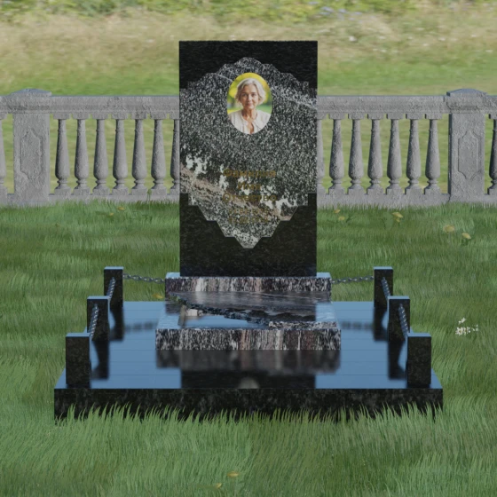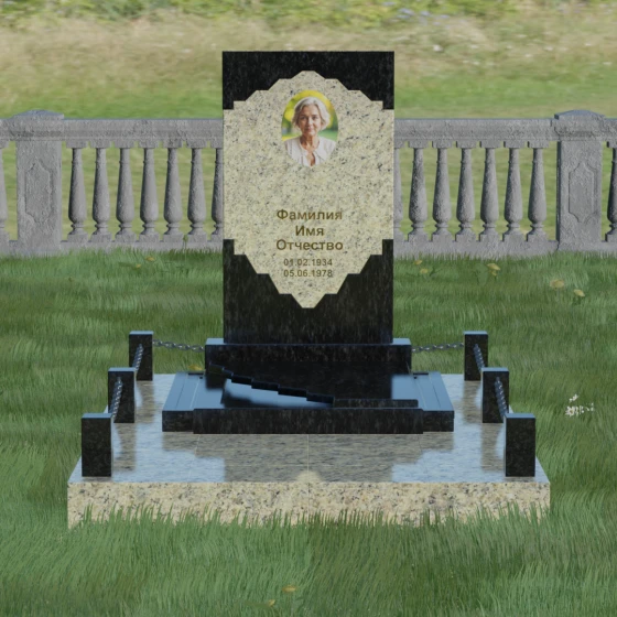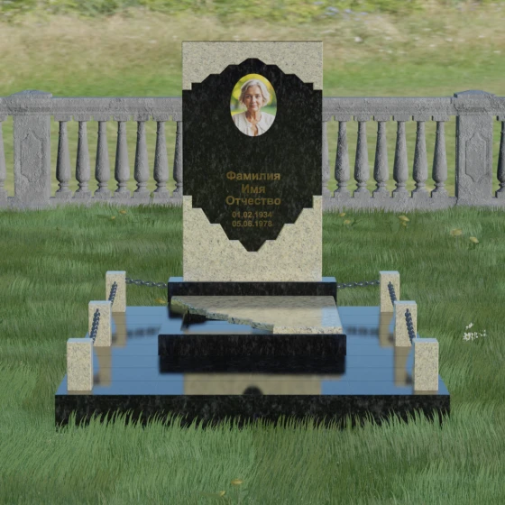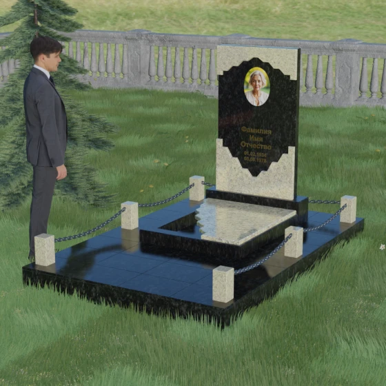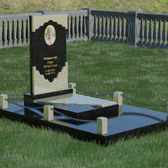 В этой модели особое внимание уделено игре фактур и визуальному объему. Зеркальная полировка темного гранита обладает глубоким, почти космическим блеском, в котором отражается мир, подчеркивая монументальность и вечность камня. В противовес ей, светлая центральная часть имеет более мягкий визуальный тон, что позволяет акцентировать внимание на портрете и эпитафии. Ритуальное изделие дополнено комплексным благоустройством участка: основание облицовано гранитной плиткой, что не только создает эстетическую завершенность, но и гарантирует чистоту и легкость в уходе. Массивный гранитный цоколь по периметру укрепляет конструкцию, а декоративные столбики с металлическими цепями очерчивают границы сакрального пространства, создавая атмосферу уединения и покоя.