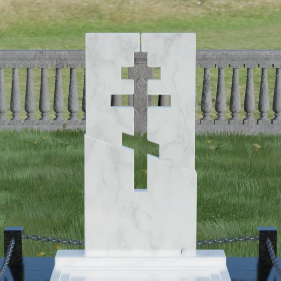 Данная модель — это торжество современной архитектуры и глубокого сакрального смысла. В центре композиции находится величественная стела, состоящая из двух контрастных блоков, разделенных динамичной диагональной линией. Этот художественный прием символизирует границу между земным и вечным, светом и тенью. Главной особенностью изделия является филигранная сквозная резьба: в самом сердце камня вырезан православный восьмиконечный крест. Лаконичность форм подчеркивает строгость и достоинство, а отсутствие лишнего декора позволяет сфокусироваться на главном символе веры.