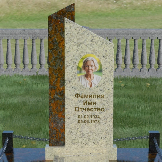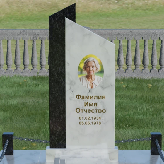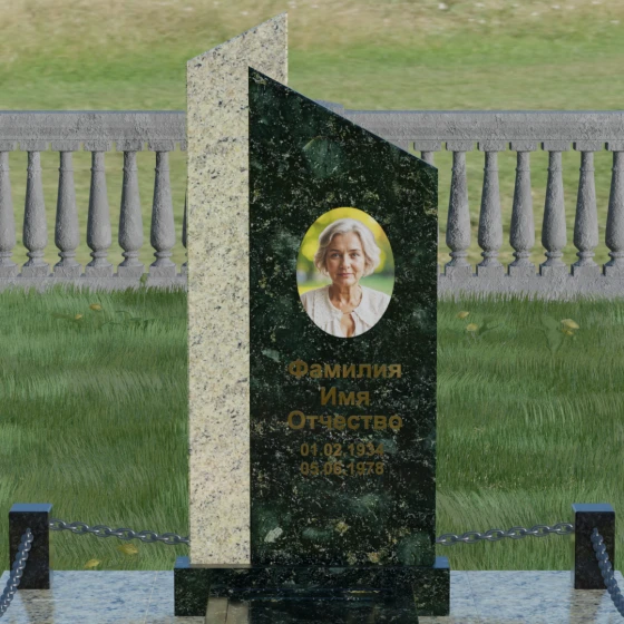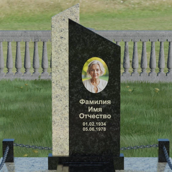Центральным элементом ансамбля является величественная стела, состоящая из двух вертикальных полотен разного цвета и фактуры. Геометрия модели построена на строгих линиях и асимметричных срезах: верхушки обеих частей камня скошены под углом, что создает эффект устремленности ввысь и символизирует духовный подъем. Игра контрастов здесь возведена в абсолют — сочетание светлого, зернистого гранита и темного, глубоко полированного камня позволяет подчеркнуть многогранность человеческой личности.
