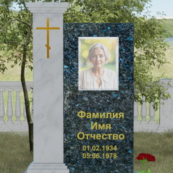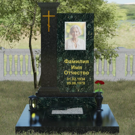 Композиция данного надгробия построена на гармоничном сочетании двух вертикальных элементов, установленных на массивное ступенчатое основание. Левая часть выполнена в виде величественной колонны с декоративным навершием в классическом стиле. На фронтальной стороне колонны расположена гравировка православного креста, покрытая сусальным золотом или имитирующим его составом, что придает мемориалу торжественный и одухотворенный вид. Правая часть — это лаконичная прямоугольная стела, предназначенная для размещения портрета и памятных надписей. Строгая геометрия линий подчеркивает внутреннюю силу и достоинство того, чья память здесь увековечена.