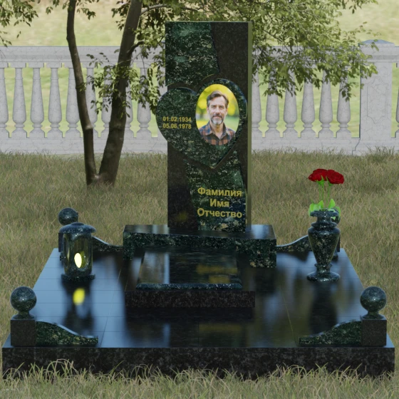 Кому подойдет: Данная модель является универсальной, однако за счет центрального символа — сердца — чаще всего выбирается для оформления женских захоронений. Она станет достойным выражением любви и вечной памяти для матери, супруги, дочери или сестры. Сложная геометрия и наличие декоративных элементов (вазы, шаров) делают это ритуальное изделие идеальным выбором для тех, кто ищет современный, эстетически насыщенный мемориал, сочетающий в себе европейский стиль и традиционную прочность натурального камня.