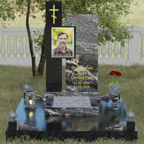 Оформление: Для данной формы идеальным решением станет использование сусального золота или специальной высокопрочной краски «под золото» для гравировки ФИО и дат. Это создаст единый ансамбль с золоченым крестом и добавит композиции торжественности. Портрет рекомендуется выполнять на керамике или в виде лазерной гравировки с мягкой растушевкой краев, чтобы изображение органично «вписывалось» в структуру камня, не нарушая его визуальной целостности. Нижняя часть композиции дополняется изящными аксессуарами: каменные шары или вазы для цветов, выполненные из того же материала, что и стела, завершают благоустройство участка, создавая законченный и гармоничный вид мемориального пространства.