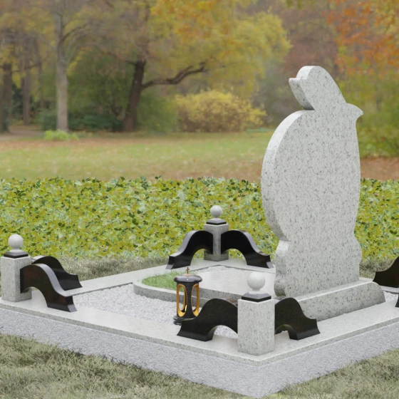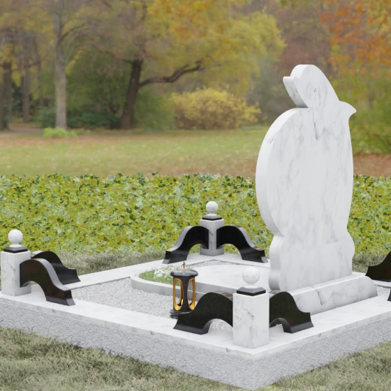 • Ритуальные аксессуары: Изящная каменная ваза для живых цветов и закрытая лампада (подсвечник) для зажжения поминального огня выполнены в едином стиле с основным памятником.
