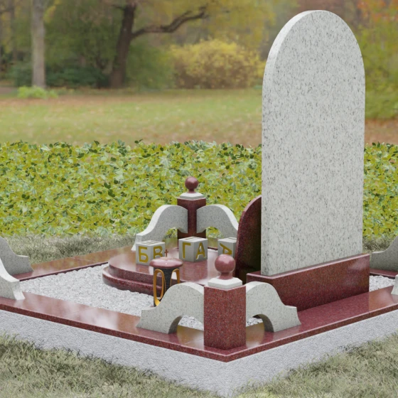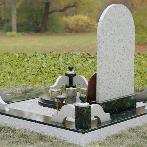 Художественное решение памятника продумано до мелочей, включая элементы благоустройства, которые создают единый архитектурный ансамбль. Стела установлена на массивный постамент, который обеспечивает устойчивость всей конструкции. Композицию дополняет изящный цоколь с декоративными столбиками, увенчанными каменными шарами. Эти элементы не только очерчивают границы участка, но и придают ему торжественный, законченный вид. В нижней части композиции предусмотрена отдельная вставка — овальный медальон из красного камня, идеально подходящий для размещения фотокерамики или гравированного портрета. Такое расположение позволяет гармонично разделить текстовую информацию и визуальный образ, не перегружая основную художественную часть.