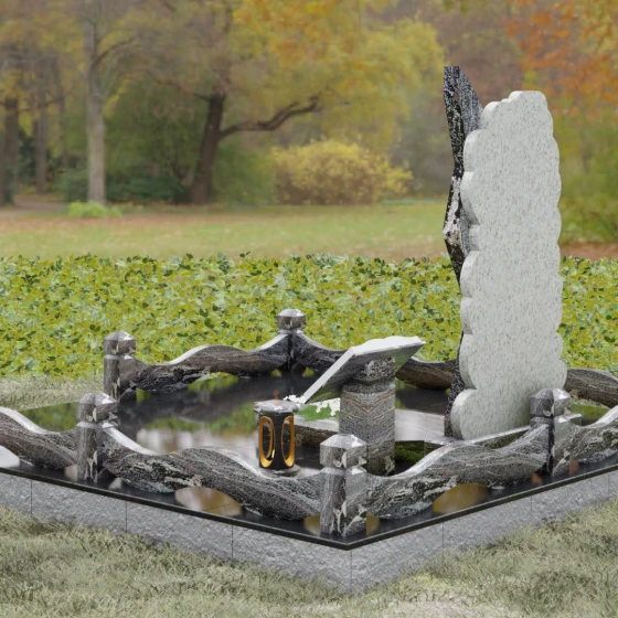 Модель «Артикул 188» представляет собой сложную архитектурную композицию, построенную на эффектном контрасте форм и материалов. Центральная стела выполнена в асимметричном стиле: основная часть из темного гранита имеет строгую вертикальную направленность с резким, устремленным ввысь навершием. Левая грань стелы украшена четырьмя четкими диагональными ступенчатыми вырезами, которые придают памятнику динамику и подчеркивают твердость характера усопшего. Эта темная плита словно «вырастает» из обрамления из светлого камня, край которого обработан в виде мягких, пушистых облаков или морской пены.
