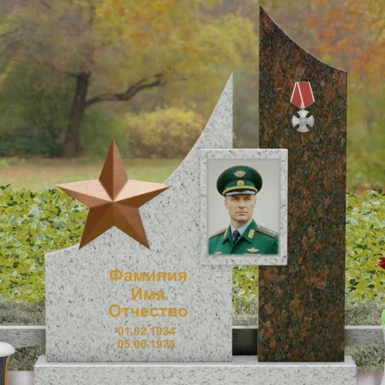 В основе художественной концепции лежит динамичная асимметрия, которая придает всей структуре современный, «европейский» облик. Центральная стела состоит из двух контрастных блоков, объединенных общим основанием. Левая часть, выполненная из темного полированного камня, имеет резкий диагональный срез, направленный вверх. На ее вершине закреплена объемная пятиконечная звезда с эффектом бронзового напыления — мощный акцент, подчеркивающий статус и заслуги покойного. Правая часть композиции представляет собой высокий вертикальный пилон из фактурного коричнево-красного гранита, на верхнем сегменте которого расположена детальная реплика ордена Мужества.