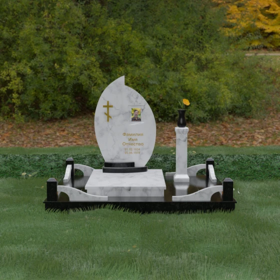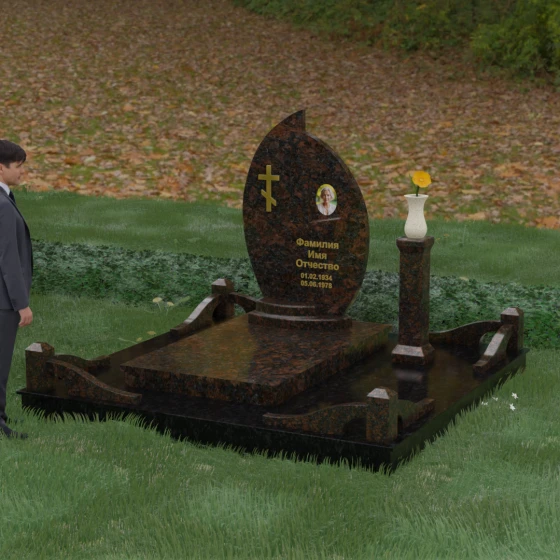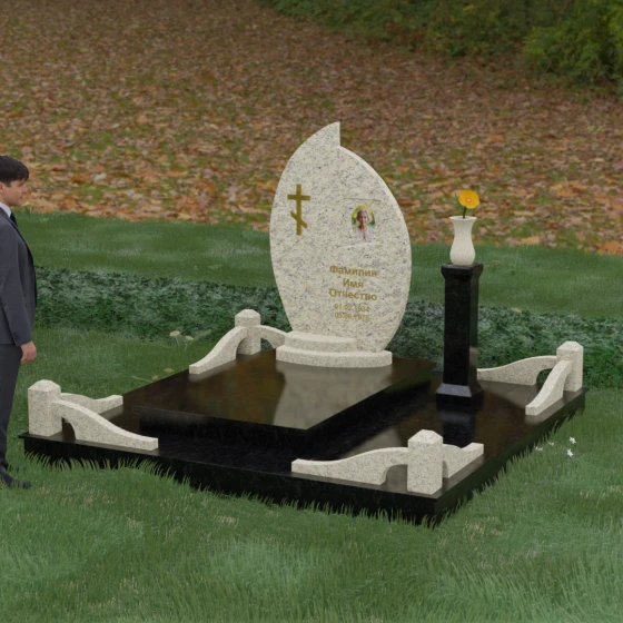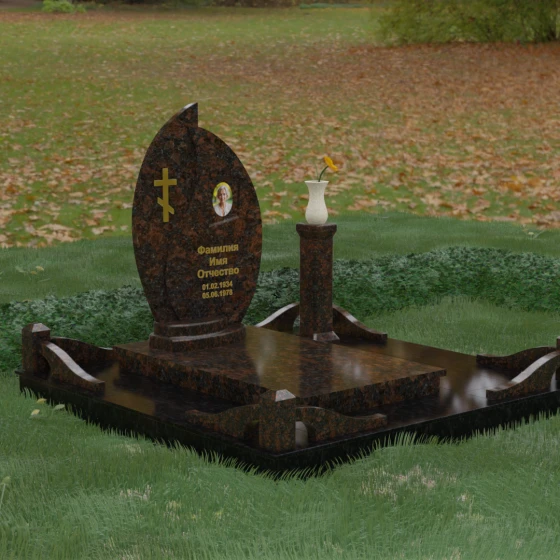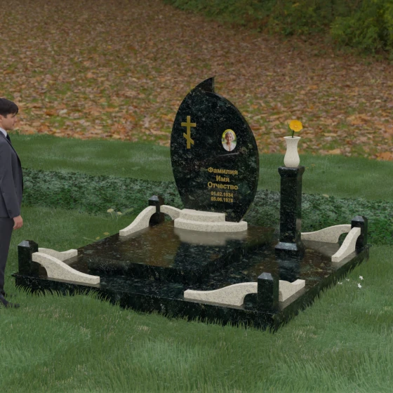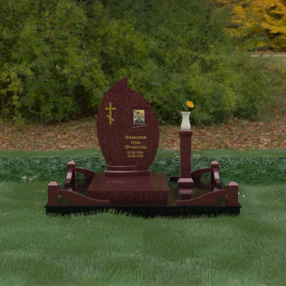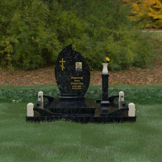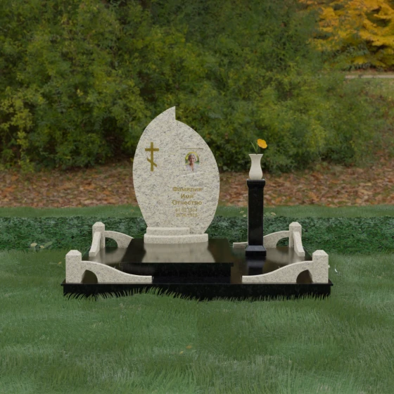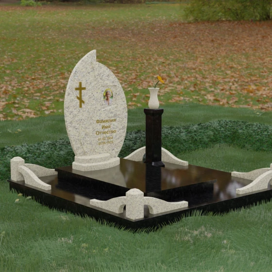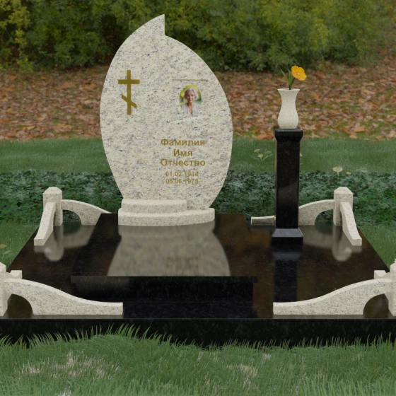Выбор мемориального ансамбля — это всегда поиск баланса между эстетикой и долговечностью. Данная модель (Артикул 232) представляет собой сложную многокомпонентную композицию, центром которой является величественная стела, выполненная в уникальной асимметричной форме. Своими очертаниями она напоминает застывшее пламя или лепесток, устремленный ввысь, что символизирует вечную жизнь души и неугасаемую память близких. Плавный изгиб верхней грани завершается острым пиком, создавая динамичный и в то же время одухотворенный силуэт. Мастерская обработка камня позволяет добиться идеальной зеркальной полировки основной плоскости, которая эффектно контрастирует с матовыми светлыми элементами подставки и ограждения.