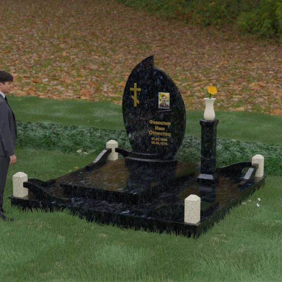 Особое внимание уделено деталям благоустройства. Весь участок оформлен как единое архитектурное пространство: вместо открытого грунта используется массивная монолитная плита, полностью перекрывающая место захоронения. Это не только придает объекту законченный и респектабельный вид, но и гарантирует безупречный порядок на десятилетия, исключая прорастание травы. Периметр обозначен низким цоколем с акцентными столбиками, между которыми установлены изящные дугообразные перемычки из светлого гранита. Завершает ансамбль высокая стройная колонна-подставка с каменной вазой, позволяющая достойно оформить подношение живых цветов.