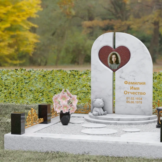 Данный гранитный монумент представляет собой сложную архитектурную композицию, где классические каноны мемориального искусства встречаются с современным европейским стилем. Выбор этой модели обусловлен её глубоким символизмом: центральный элемент выполнен в виде асимметричного полотна с изящным вырезом в форме сердца. Этот художественный прием превращает холодный камень в осязаемое воплощение любви и непреходящей скорби. Плавный изгиб верхней грани и вертикальное разделение основной плиты создают динамичный, но при этом умиротворенный силуэт, который гармонично доминирует над пространством захоронения.