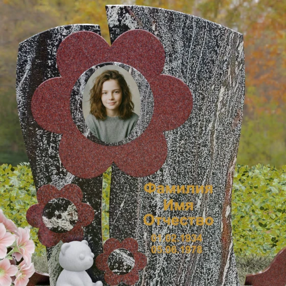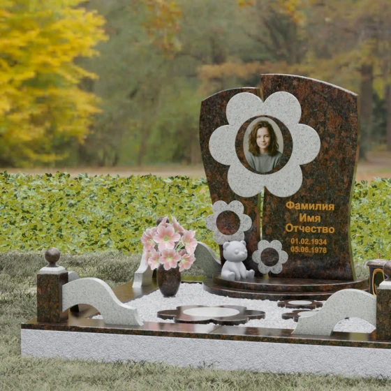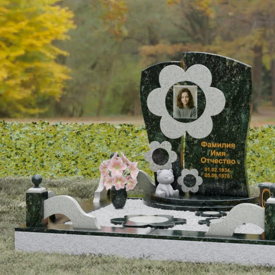 Представленный мемориальный ансамбль (Артикул 241) — это не просто памятник, а подлинное художественное произведение, в котором застыла нежность и вечная весна. В центре композиции находится величественная стела, выполненная в уникальной комбинированной технике. Ее асимметричная форма с деликатным вертикальным разделением создает динамичный и в то же время гармоничный силуэт. Главным акцентом является искусно вырезанный из камня цветок, в сердцевину которого помещен портрет. Плавные, округлые лепестки символизируют чистоту и хрупкость жизни, а их объемная фактура создает удивительную игру света и тени, контрастируя с глубокой зеркальной полировкой основного полотна стелы.