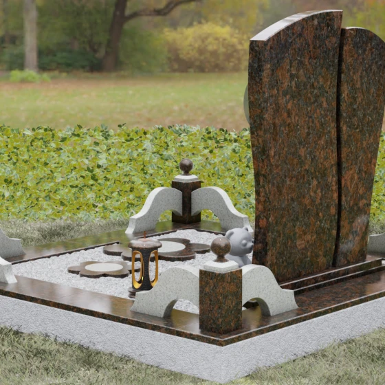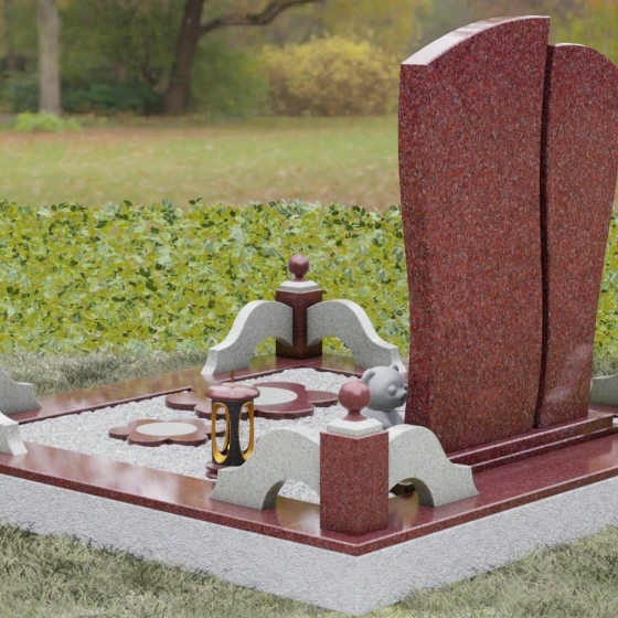 Мастерство камнереза здесь проявляется в каждой детали: от точно выверенных изгибов основной плиты до малых декоративных цветов у подножия, которые словно «прорастают» сквозь твердый гранит. Благоустройство участка выполнено в едином стилистическом ключе, создавая законченный и торжественный вид. Основание памятника опирается на сложный многоуровневый цоколь. Массивный каменный бордюр с плавными волнообразными линиями обрамляет место захоронения, обеспечивая эстетическую чистоту и легкость в уходе. Углы композиции акцентированы изящными столбиками с навершиями в виде полированных шаров, а установленная каменная лампада и скульптурная фигурка медвежонка добавляют мемориалу особую душевную теплоту и индивидуальность.