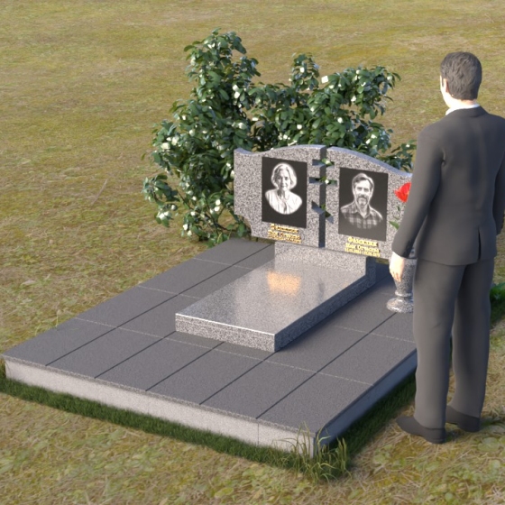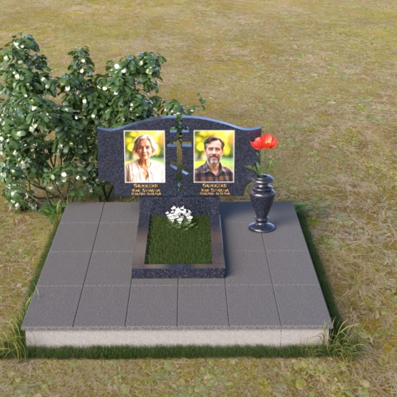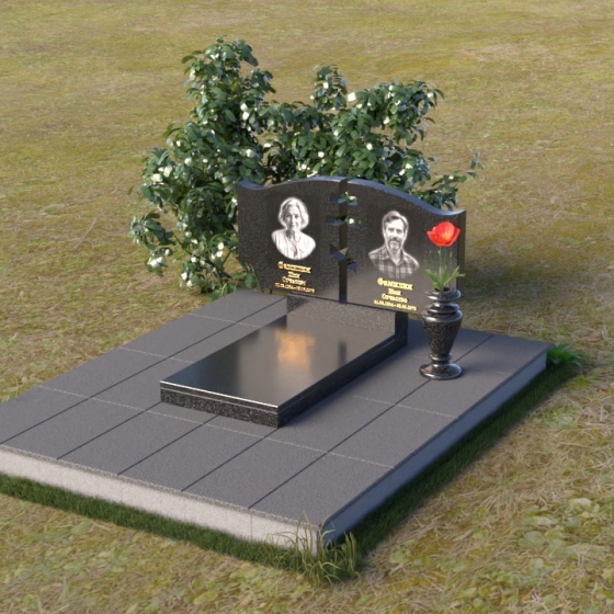 Величественная стела памятника ПГ016 представляет собой композицию из двух вертикальных элементов, объединенных общей идеей и стилем. Каждый элемент имеет свою индивидуальную форму, но вместе они создают гармоничный и целостный образ. Стела выполнена из полированного гранита глубокого черного цвета, который служит идеальным фоном для гравировки портретов и надписей. Контраст между гладкой, зеркальной поверхностью и выгравированными изображениями создает эффект глубины и выразительности. Между двумя стелами прорезана фигура креста, символизирующая веру и духовность. Этот элемент добавляет композиции особое значение и подчеркивает ее сакральный характер. Справа от портрета выгравирована изящная роза, ее лепестки искусно проработаны, создавая ощущение объема и реалистичности. Цветы символизируют любовь, память и скорбь об ушедшем.