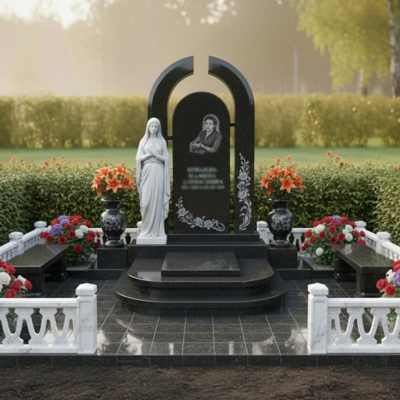 Мемориальная композиция установлена на многоуровневое основание, состоящее из нескольких ступеней, которые придают ей дополнительную высоту и торжественность. Каждая ступень тщательно отполирована, отражая свет и создавая эффект парящей конструкции. По периметру комплекса возведен массивный гранитный цоколь, выполненный из светлого мрамора с элегантными балясинами, что придает благоустройству завершенный и гармоничный вид. Цоколь создает четкие границы участка, отделяя его от окружающего пространства и придавая ему особую сакральность. Надгробная плита, выполненная из черного полированного гранита, гармонично вписывается в общую концепцию, создавая единое целое со стелой. Её идеально гладкая поверхность не только упрощает уход за местом упокоения, но и служит прекрасным фоном для декоративных элементов. По бокам от центральной стелы расположены две элегантные каменные вазы с букетами алых и фиолетовых цветов, которые привносят в композицию яркие акценты и символизируют жизненную силу и вечную красоту. Рядом с вазами, на уровне надгробной плиты, размещены две гранитные скамьи с мраморными опорами, приглашающие к тихому размышлению и воспоминаниям. Скульптура скорбящей женщины в античном стиле, расположенная слева от стелы, является мощным символом скорби и вечной памяти, придавая композиции глубокий эмоциональный смысл. Её плавные линии и выразительный образ гармонично дополняют общую архитектуру.