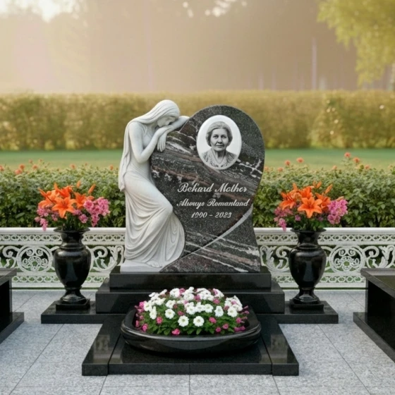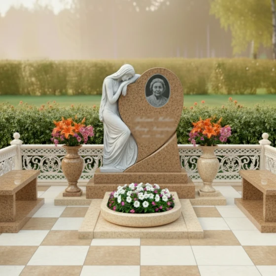 Эта мемориальная композиция, артикул ПН 103, представляет собой воплощение глубокой скорби и нежности, запечатленных в камне. В центре внимания — стела, выполненная в форме стилизованного сердца, которое плавно переходит в асимметричную волну. Этот изгиб не просто элемент дизайна, он символизирует бесконечность жизненного пути и неизбежность перехода в вечный покой, при этом сохраняя теплоту воспоминаний. Левая часть стелы увенчана изящной скульптурой скорбящей женщины. Её фигура, выполненная с невероятной детализацией, прислонилась к сердцу, выражая безмолвную печаль. Драпировка её одежд, кажется, струится по камню, создавая ощущение легкости и воздушности, несмотря на массивность материала. Контраст между зеркально отполированной поверхностью основного черного гранита и матовым, словно припорошенным инеем, срезом камня на фигуре скорбящей женщины, подчеркивает глубину эмоций и придает композиции особую выразительность. В правой части сердца, в обрамлении лаконичного овала, располагается место для портрета, словно медальон, хранящий драгоценный образ. Под портретом, на идеально гладкой поверхности, предусмотрено место для эпитафии, где каждое слово обретает особую значимость.