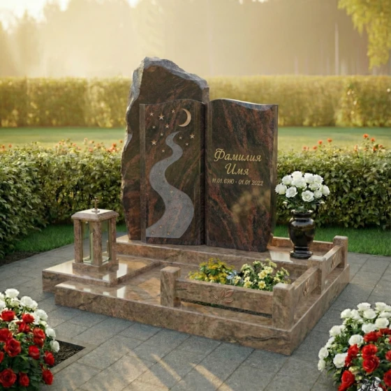 Монумент установлен на массивный, многоуровневый гранитный цоколь, который не только придает всей конструкции исключительную устойчивость, но и формирует завершенную архитектурную композицию. Нижний уровень цоколя имеет широкую, полированную поверхность, создающую ощущение надежности и прочности. Следующий уровень, чуть более узкий, создает эффект ступеней, ведущих к самим стелам. Надгробная плита, выполненная в едином стиле с цоколем и стелами, закрывает всю площадь захоронения, что не только придает участку ухоженный и законченный вид, но и значительно упрощает уход за ним, избавляя от необходимости прополки и поддержания чистоты. По периметру надгробной плиты расположены изящные бортики, образующие две прямоугольные клумбы, предназначенные для живых цветов. В них уже высажены яркие композиции, символизирующие жизнь и память. Дополнительно, в композицию включены элегантная гранитная ваза для цветов, выполненная в той же зеркальной полировке, что и правая стела, и изящный каменный подсвечник-фонарь, который позволяет разместить лампадку, создавая атмосферу уюта и вечной памяти.