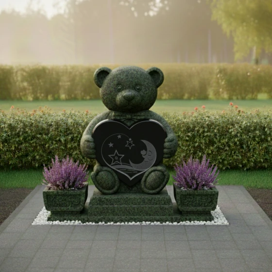 Центральным элементом композиции является изваяние в форме милого плюшевого медвежонка, выполненное из тёмного камня. Каждая деталь медвежонка проработана с удивительной тщательностью: от округлых ушек и лапок до фактурной имитации шерсти, которая придаёт фигуре мягкость и одухотворённость, несмотря на твёрдость материала. Медвежонок держит в лапках сердце — универсальный символ любви, которое становится своеобразным порталом в мир воспоминаний. На поверхности сердца выгравированы звёзды и полумесяц, создающие атмосферу тихой ночи, полной светлых грёз и нежности. Эти небесные мотивы придают композиции дополнительный символизм, напоминая о вечности души и бесконечности любви.