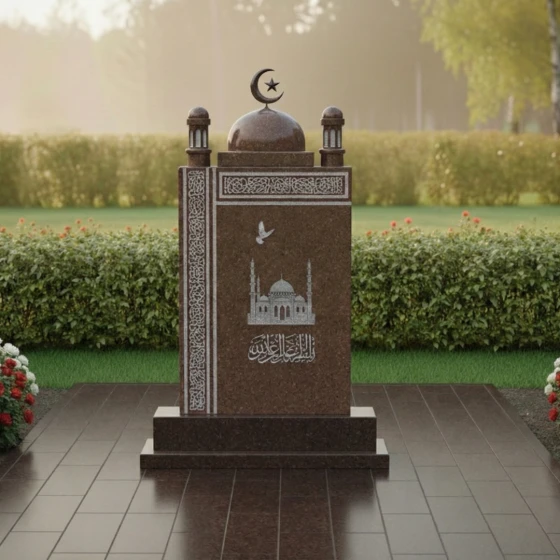 Каждая деталь этой модели наполнена глубоким смыслом. Форма купола символизирует небесный свод и защиту, которую обретает ушедший под сенью Всевышнего. Минареты, устремленные ввысь, олицетворяют духовную вертикаль и постоянную связь между земным и вечным. Декоративное мощение участка крупной каменной плиткой серого оттенка создает ощущение чистоты и завершенности, исключая прорастание сорной травы и подчеркивая статусность захоронения. Ступенчатое основание (цоколь) обеспечивает конструкции исключительную устойчивость, приподнимая святыню над землей, что символизирует возвышение духа над тленом.