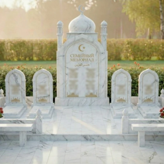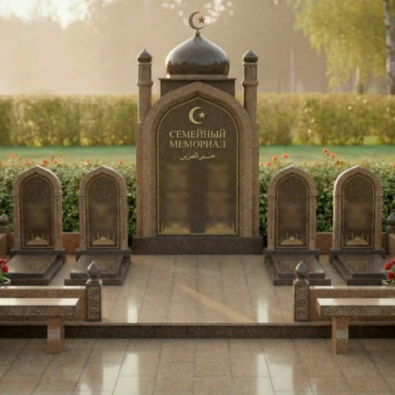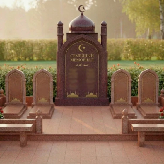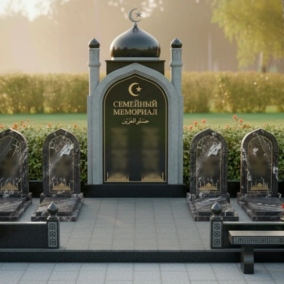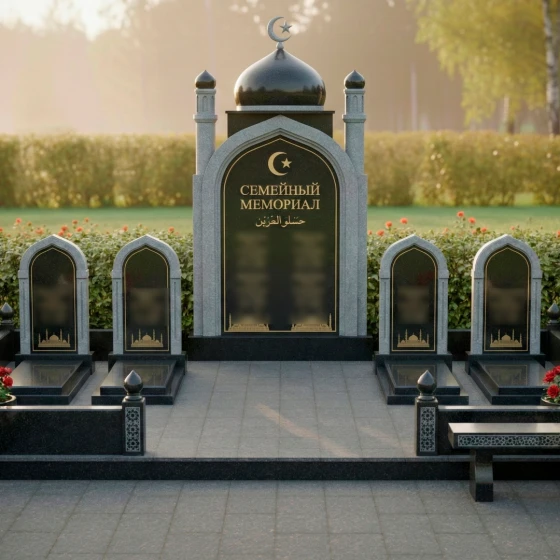 Оформление: Для центральной арки я рекомендую использовать сусальное золото при нанесении фамилии рода и каллиграфии — это подчеркнет статусность объекта. Для индивидуальных стел идеально подойдет лазерная гравировка портретов высокой четкости: на темном полированном камне лица будут выглядеть живыми, сохраняя теплоту взгляда на десятилетия. Если вы предпочитаете аскетичность, можно ограничиться только золоченым арабским орнаментом и текстами из священных книг.