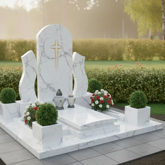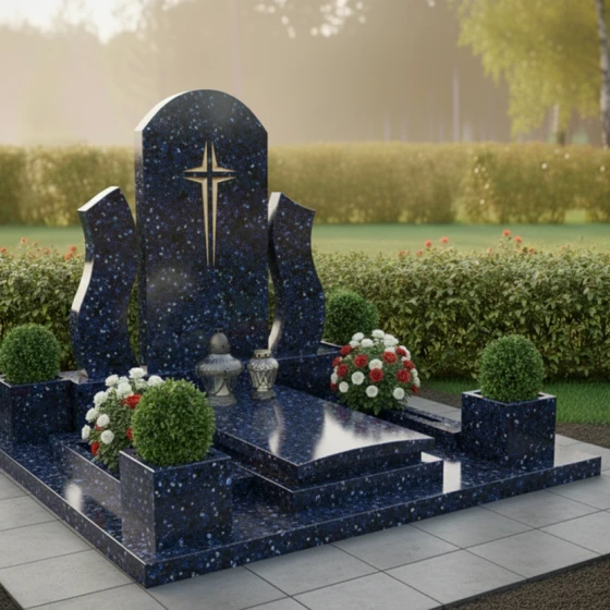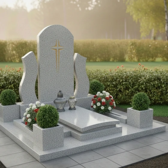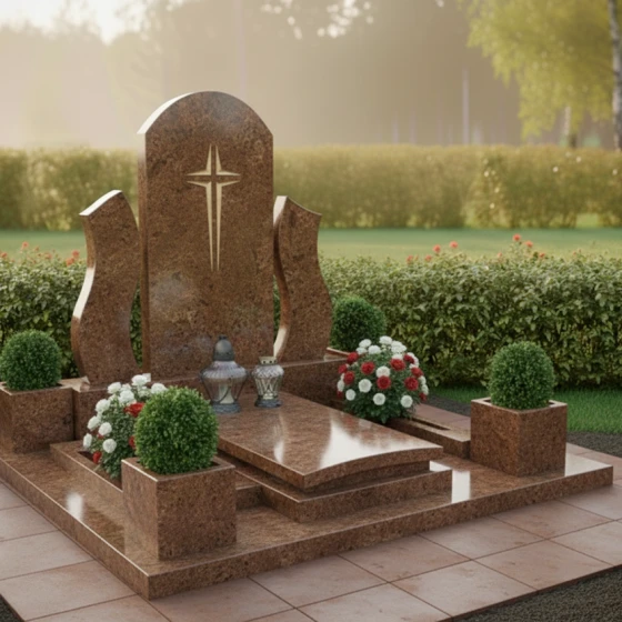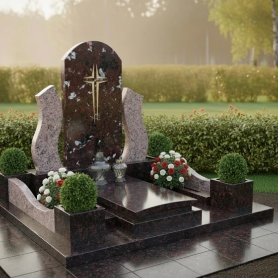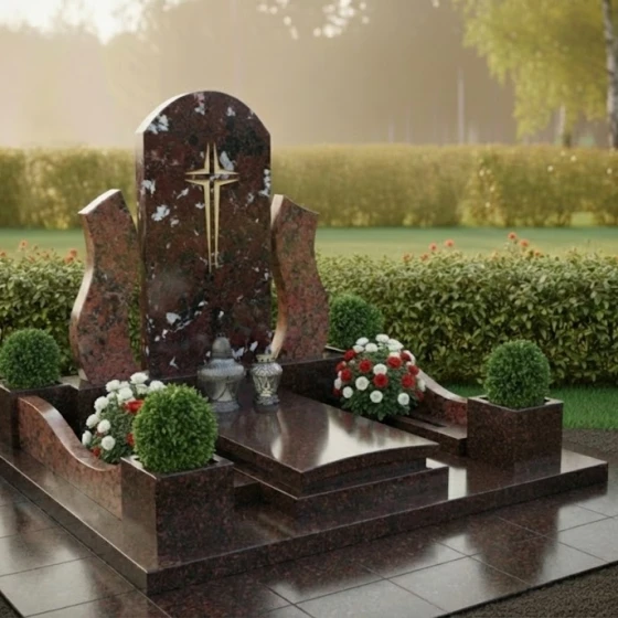 • Комплектация: Основная стела, боковые декоративные элементы, многоуровневая надгробная плита, массивный цоколь.