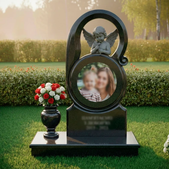 Венчает композицию детально проработанная скульптура ангела-хранителя. Фигура херувима выполнена в технике глубокой резьбы с матовой фактурой, которая эффектно контрастирует с зеркально отполированной поверхностью основного камня. Маленький ангел, склонивший голову в молитвенном смирении, держит в руках лаконичный четырехконечный крест. Каждое перо на его раскрытых крыльях прорезано с исключительной точностью, создавая игру света и тени, которая делает образ живым и объемным. На правой стороне стелы изящно вырезан декоративный завиток-волюта, завершающий динамичный ритм дугообразных линий.