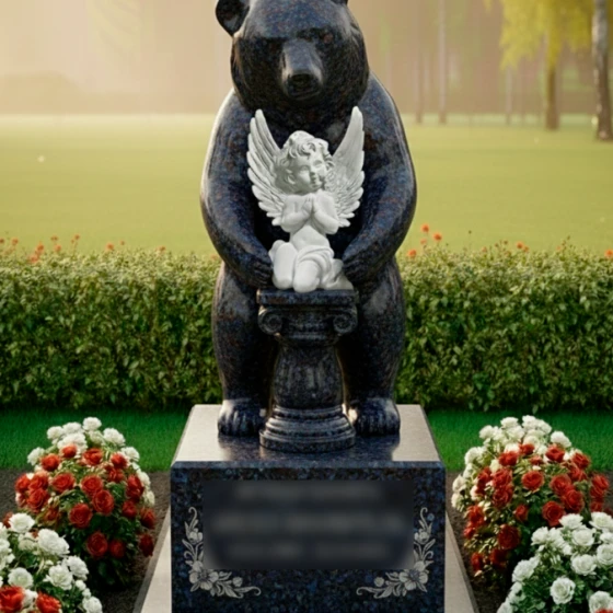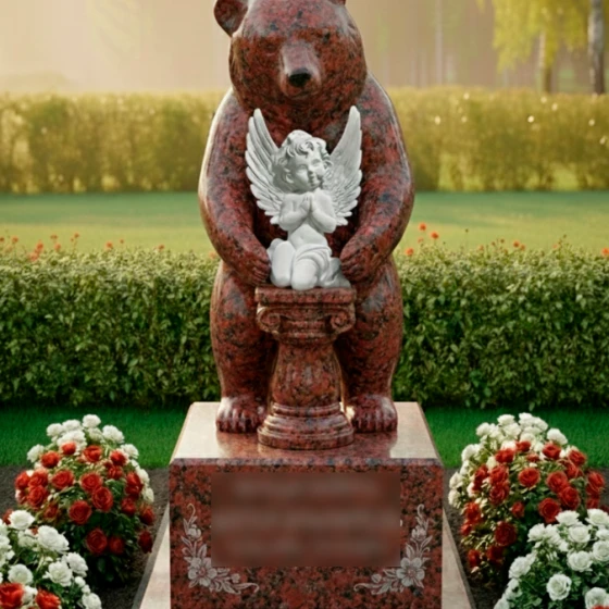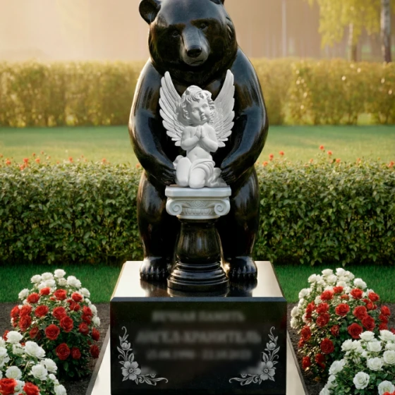 Выбор образа медведя в качестве хранителя не случаен — это символ силы, защиты и непоколебимого спокойствия. В данной интерпретации могучий зверь выступает защитником души, олицетворенной в образе маленького ангела. Ангел с молитвенно сложенными руками и детально проработанными перьями на крыльях символизирует чистоту, надежду и связь с высшими силами. Вся архитектурная группа транслирует идею безопасности: покой ушедшего человека находится под надежной защитой, которую не в силах разрушить ни время, ни внешние обстоятельства. Это воплощение вечной опеки и преданности, застывшее в граните.