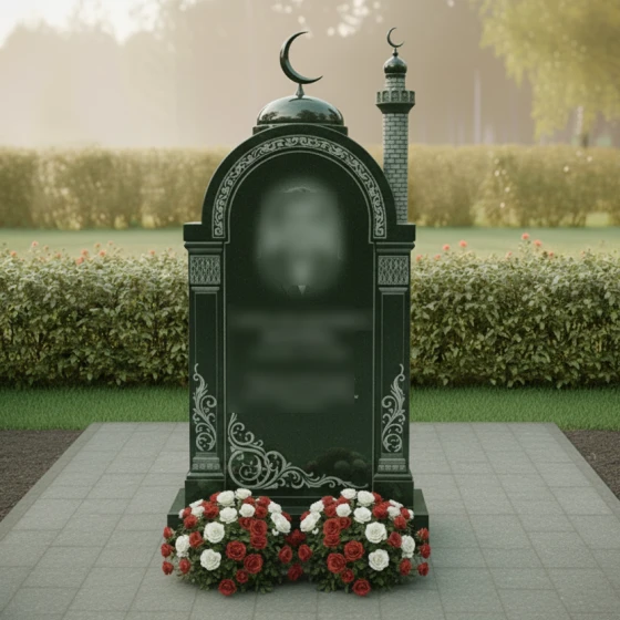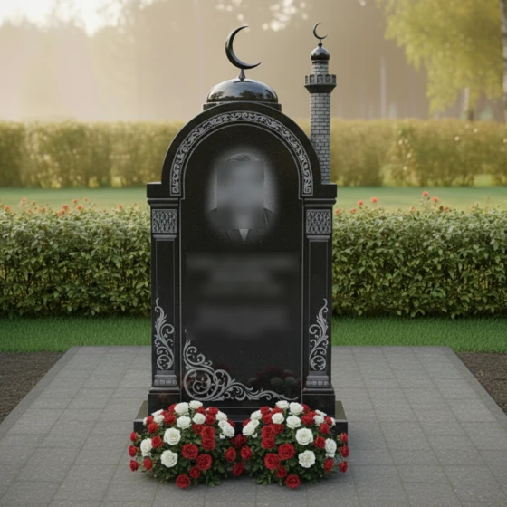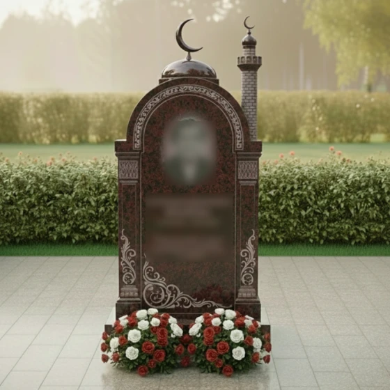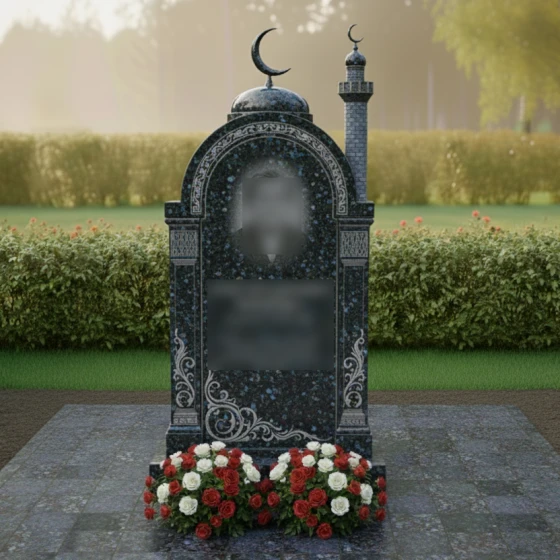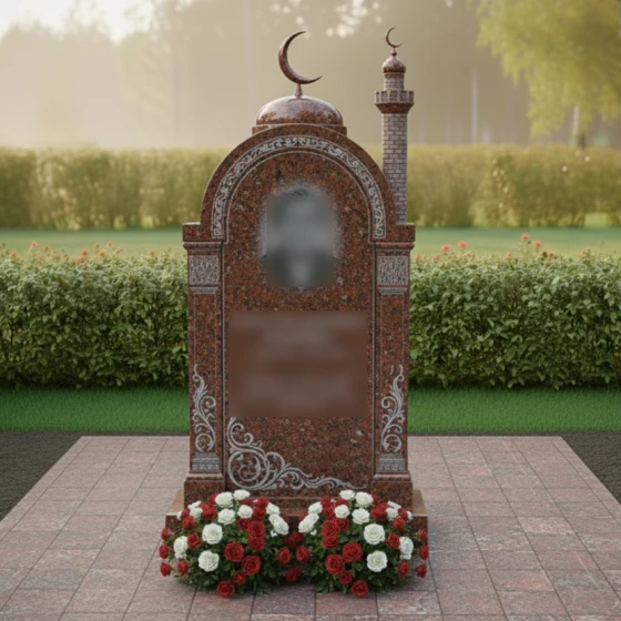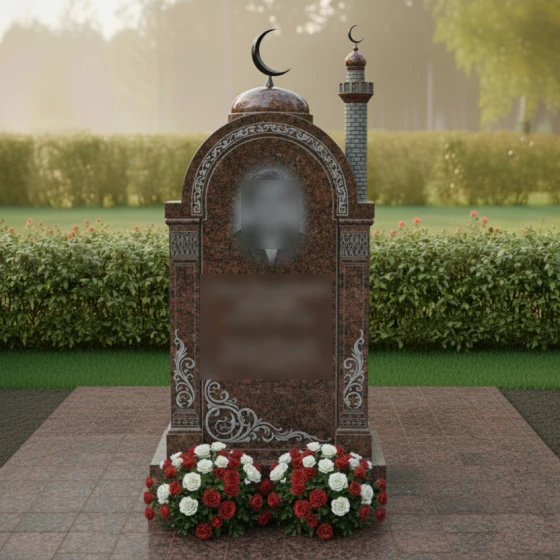 Перед вами величественная стела, выполненная в лучших традициях восточного зодчества. Центральным элементом композиции является изящная арка, увенчанная куполом с мусульманским полумесяцем. Геометрия изделия поражает своей сложностью: правая сторона дополнена реалистично исполненным минаретом с филигранной резьбой, имитирующей кирпичную кладку, и собственным навершием. Каждая грань камня прошла многоступенчатую обработку. Зеркальная полировка основной плоскости создает глубокие отражения, на фоне которых особенно эффектно смотрятся матовые резные элементы.