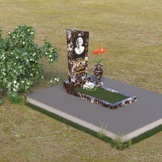 Мемориальная композиция состоит из нескольких элементов, каждый из которых тщательно продуман и выполнен с безупречным качеством. Начинается все с основания – широкой, массивной плиты, которая обеспечивает устойчивость всей конструкции. Её матовая, слегка шероховатая поверхность призвана оттенять блеск полированных элементов, создавая игру фактур и контрастов. Далее взгляд переходит к горизонтальной стеле, расположенной на постаменте. Она выполнена в виде прямоугольника с плавными, скругленными углами, что придает ей мягкость и элегантность. Поверхность стелы отполирована до зеркального блеска, отражая небо и окружающий мир, словно напоминая о связи между земным и небесным. На постаменте возвышается вертикальная стела с портретом и надписью. Верхняя часть стелы имеет скошенный угол, что добавляет динамики и оригинальности всей композиции. На стеле выгравированы имя, фамилия и отчество усопшего, а также даты жизни, выполненные изящным шрифтом. В правом углу композиции расположена ваза, предназначенная для цветов. Её классическая форма и полированная поверхность гармонично дополняют общий стиль мемориала.